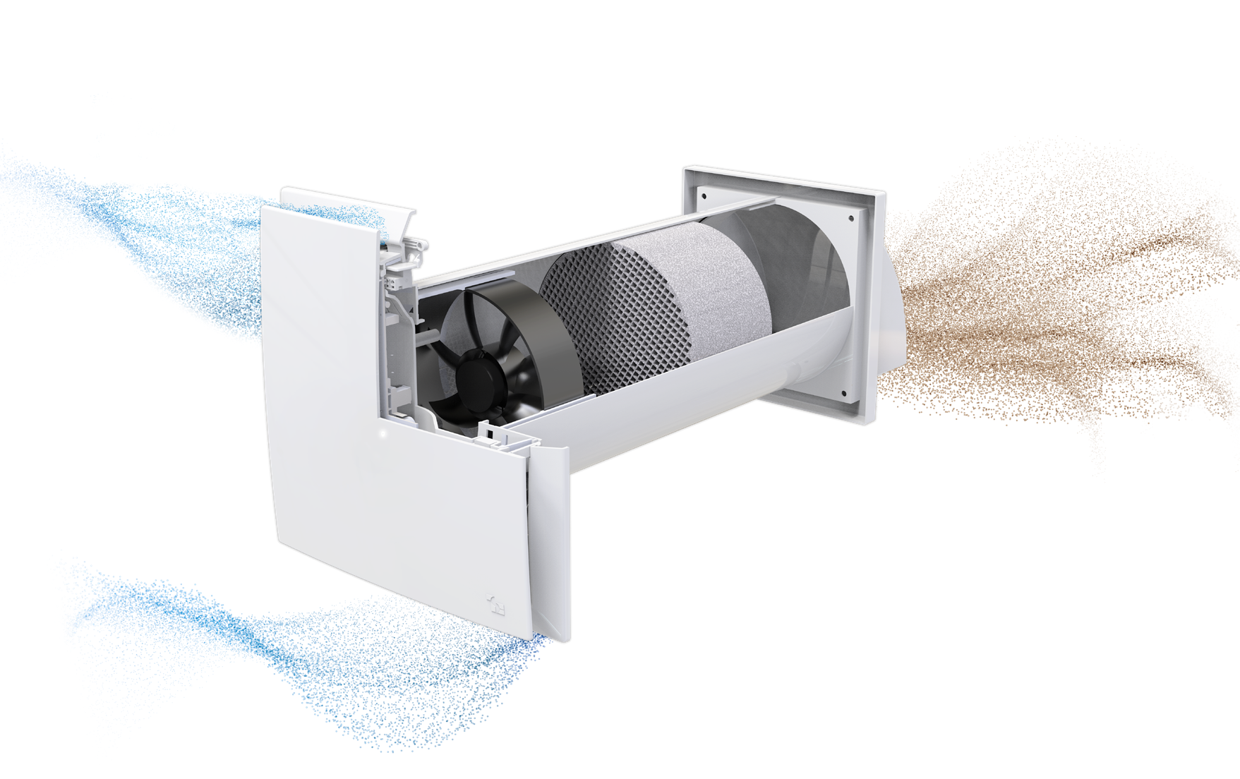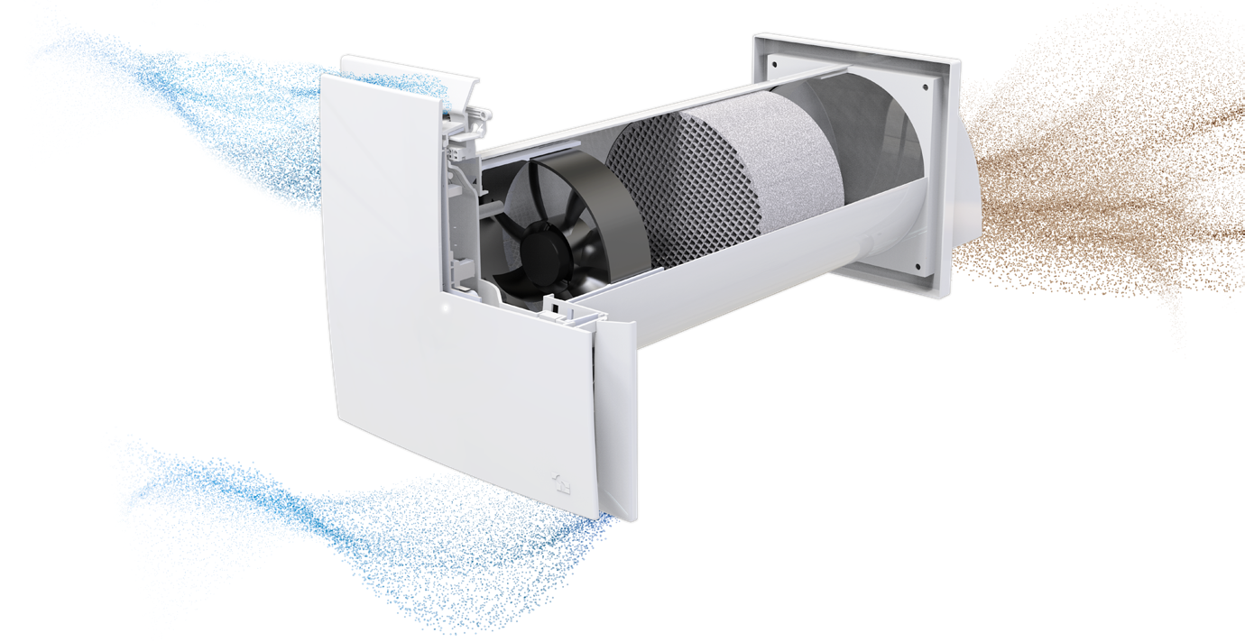 Zużyte powietrze jest zasysane przez wentylator wywiewny i dostarczane na jedną stronę wymiennika ciepła. Natomiast świeże powietrze zewnętrzne trafia na drugą stronę wymiennika ciepła. Strumienie powietrza nie mieszają się ze sobą. Co oznacza, że zużyte powietrze usuwane z budynku nie dostaje się do świeżego powietrza nawiewanego. Zachodzi intensywna wymiana ciepła między strumieniami. Wymiennik ciepła zapewnia wysoką skuteczność odzysku ciepła, nawet przy intensywnej wentylacji.