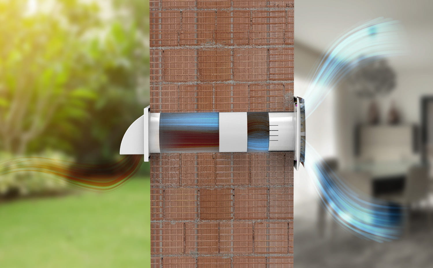 Rekuperator ścienny działa z odzyskiem ciepła.